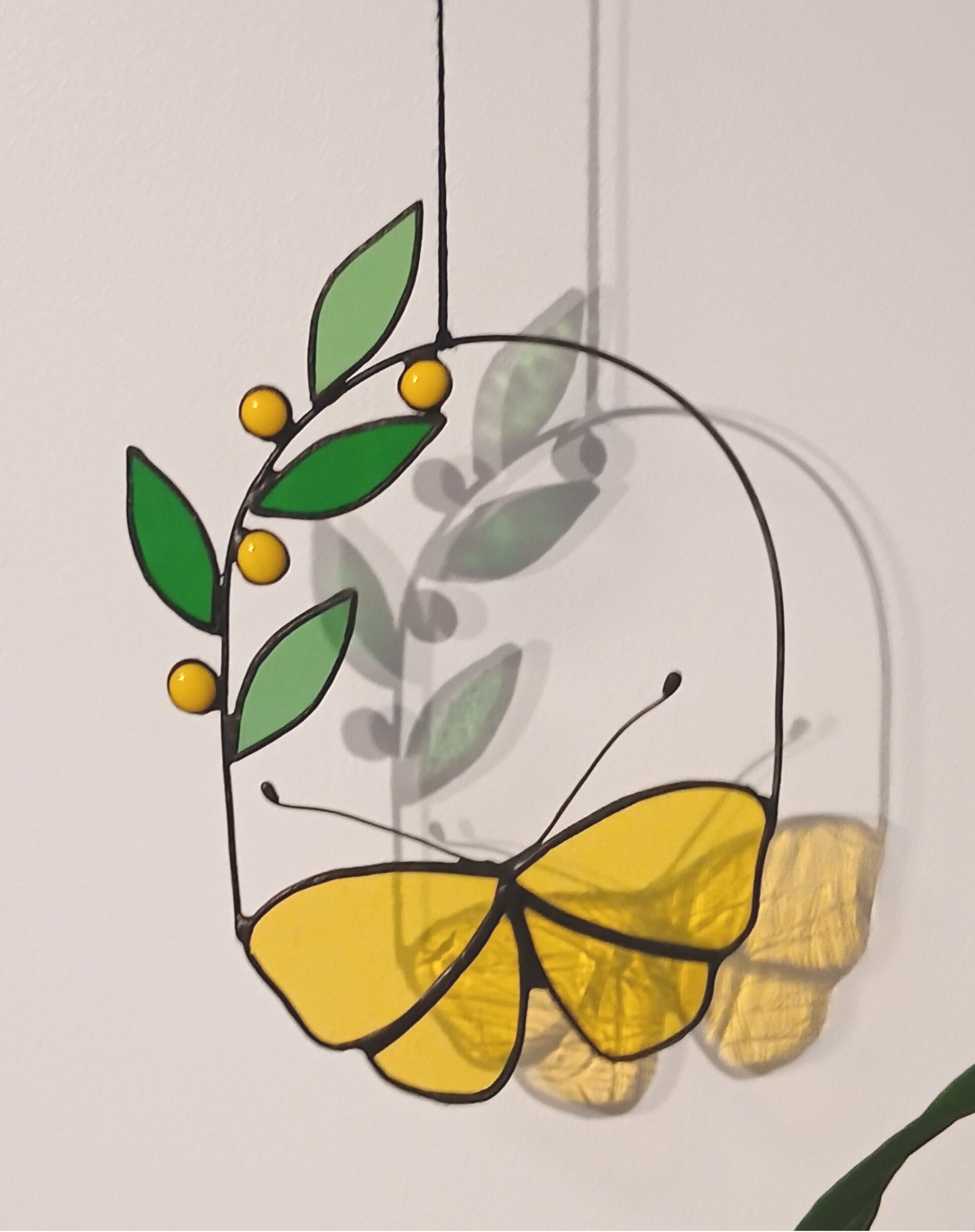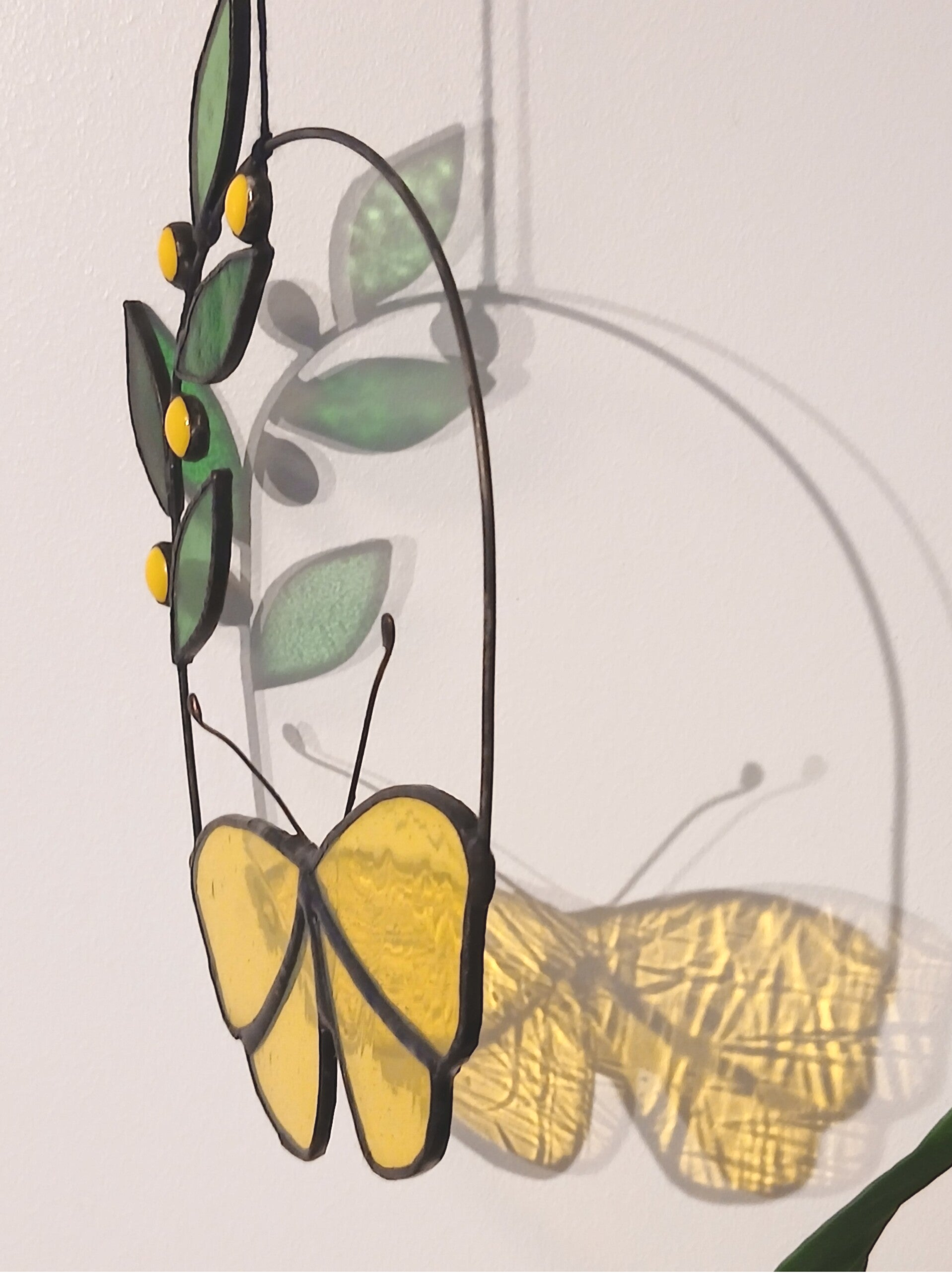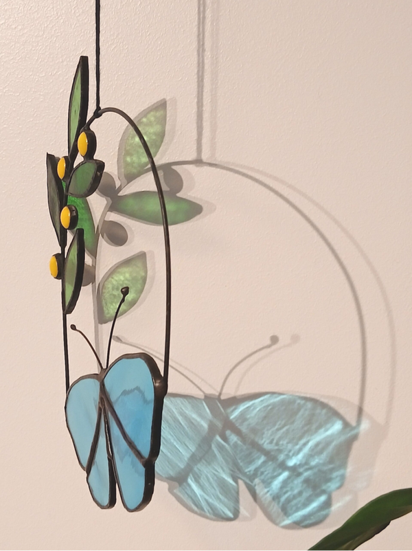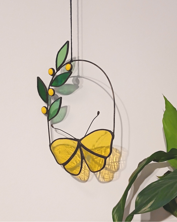 Hanger vlinder met tak verkrijgbaar in geel en blauw. Mooi als raamhanger of als wanddecoratie met een witte achtergrond. Ambachtelijk gemaakt met kwaliteitsglas in de koperfolietechniek. Afgewerkt met zwarte patine.Ongeveer 19 cm hoog en 14 cm breed.